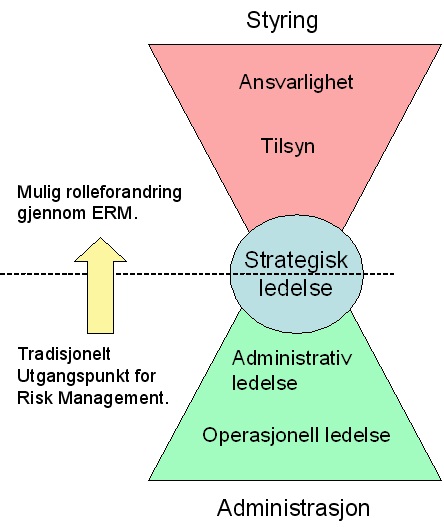 Det kan være en stor utfordring å forbedre ”Corporate Governance” praksisen ved å bygge opp en knytning mellom muligheter/trusler, gevinst og ressurser. Formell integrasjon av disse og andre styringspraksiser, slik som organisasjons-planlegging, kvalitetssikring, årlig rapportering og revisjon, som er koordinert av ledelsen, vil oppnå dette. Fig. A2-1 illustrerer relasjonen mellom ledelse, ERM og ”Corporate Governance”. Illustrasjonen setter søkelyset på betydningen av ERM på det strategiske nivået i en organisasjon. Det synes å være en generell oppfatning at det vesentligste bidrag ERM bringer inn i ”Corporate Governance” er større fokus på tilsyn og kontroll, samt klarere grenser for ansvar og myndighet.