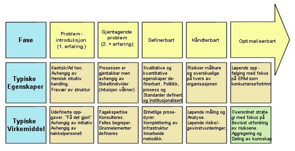 Ulike organisasjoner eller enheter vil altså ha ulike utgangspunkt og behov/mål for sine ERM-aktiviteter. Ikke minst ulik evne til å nå sine mål. Fig. 6-2 illustrerer en referanseramme som er en tilpasning av ”Carnegie Mellons”-modellen for prosessendringsevne, og kan være et godt verktøy for å sammenligne eksisterende funksjonalitet mot ønsket funksjonalitet.