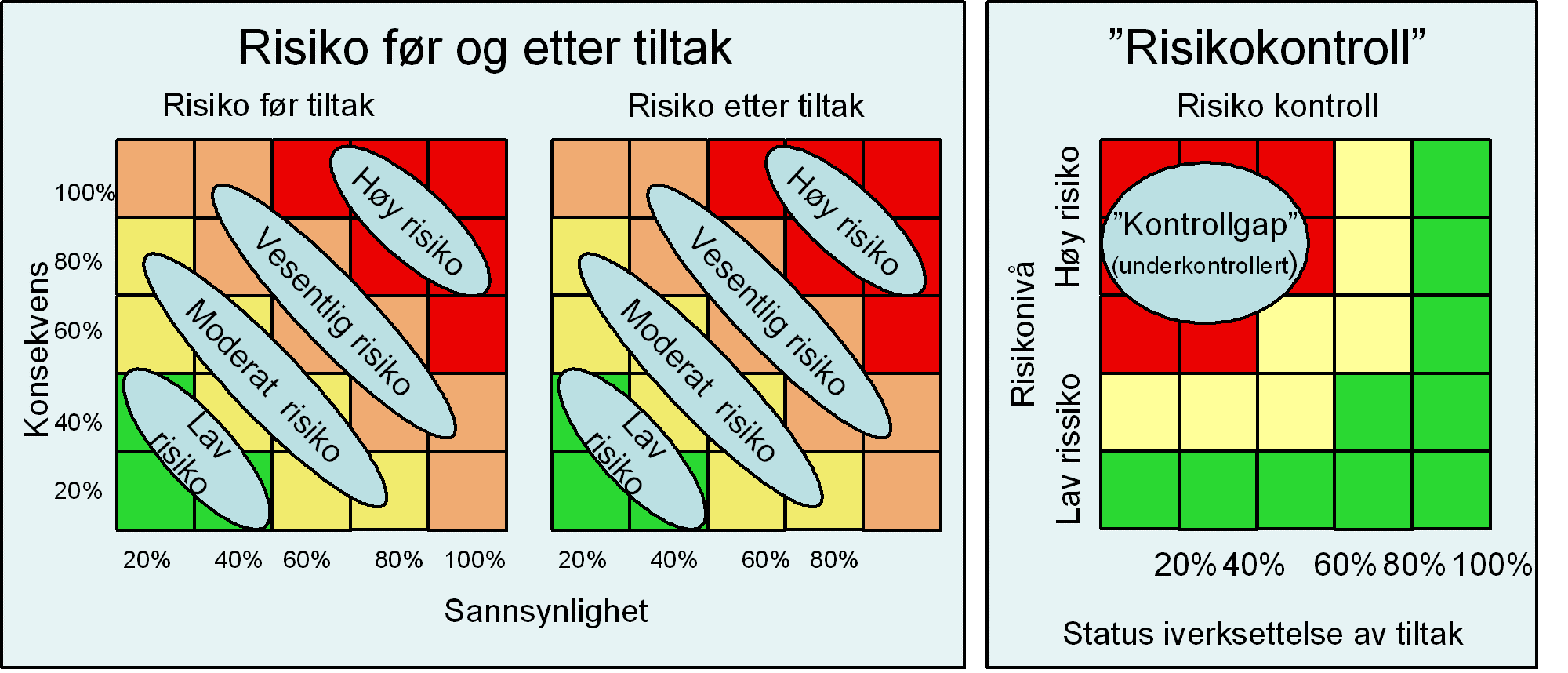 For å lette lesbarhet og kommunikasjon kan vi fremstille de nedtegnede opplysningene om den enkelte risiko grafisk. Likeledes kan organisasjonen beregne konsekvensen av foreslåtte tiltak, og om disse må kunne antas å ha det ønskede resultat (lukke et eventuelt kontrollgap).