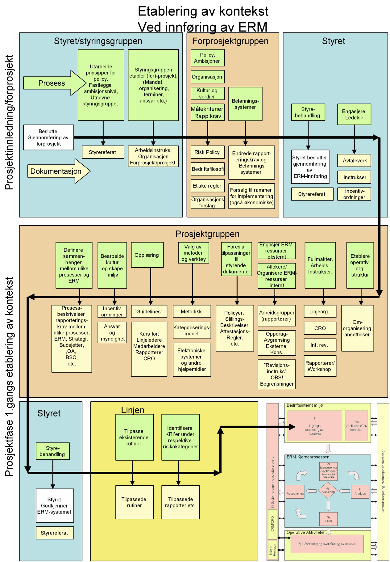 Når vi har kommet så langt at vi vurderer innføring av ERM-systemet kan det være greit å skaffe seg et noenlunde overblikk over hvordan innføringsprosessen vil se ut videre. Det er selvfølgelig mange måter å gå frem på og vår fremgangsmåte må derfor betraktes som veiledende. Likevel vil vi kunne finne mange elementer som er så generelle at vi sikker vil kunne benytte dem i vår innføringsprosess.
