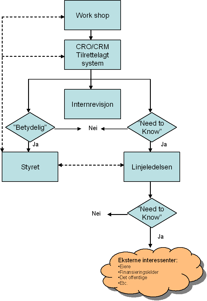 | Formål: | Rapportene skal først og fremt dokumentere og underbygge de vurderinger og valg som arbeidsgruppen har foretatt, frem til linjeorganisasjonen overtar ansvaret for realisering av de foreslåtte tiltakene. Rapportene signaliserer således overdragelsen av iverksettelsesansvaret til linjen, og fungerer som underlag for den videre prosessen. Det må også forefinnes rapporter som i særlig grad fremhever større ”ikke akseptable nedside risikoer” og vesentlige oppside risikoer (muligheter) med behov for styrets og ledelsens øyeblikkelige oppmerksomhet. Rapportene kan også fungere som ”legitimasjon” i regnskapene når organisasjonen har foretatt avsetninger for ulike risikoer i regnskapene.Dokumentasjonen:
